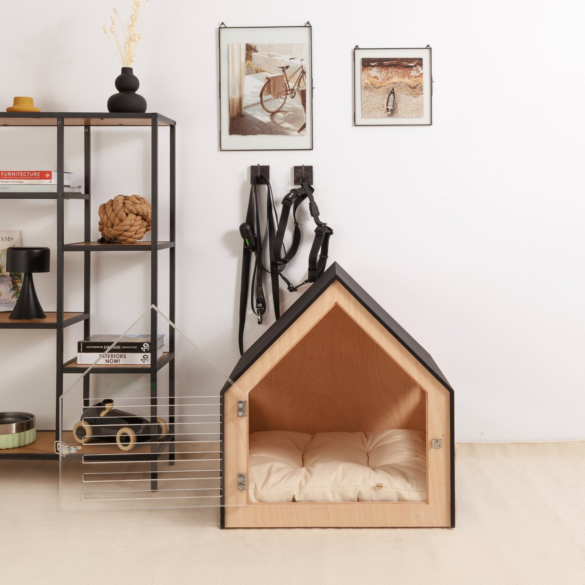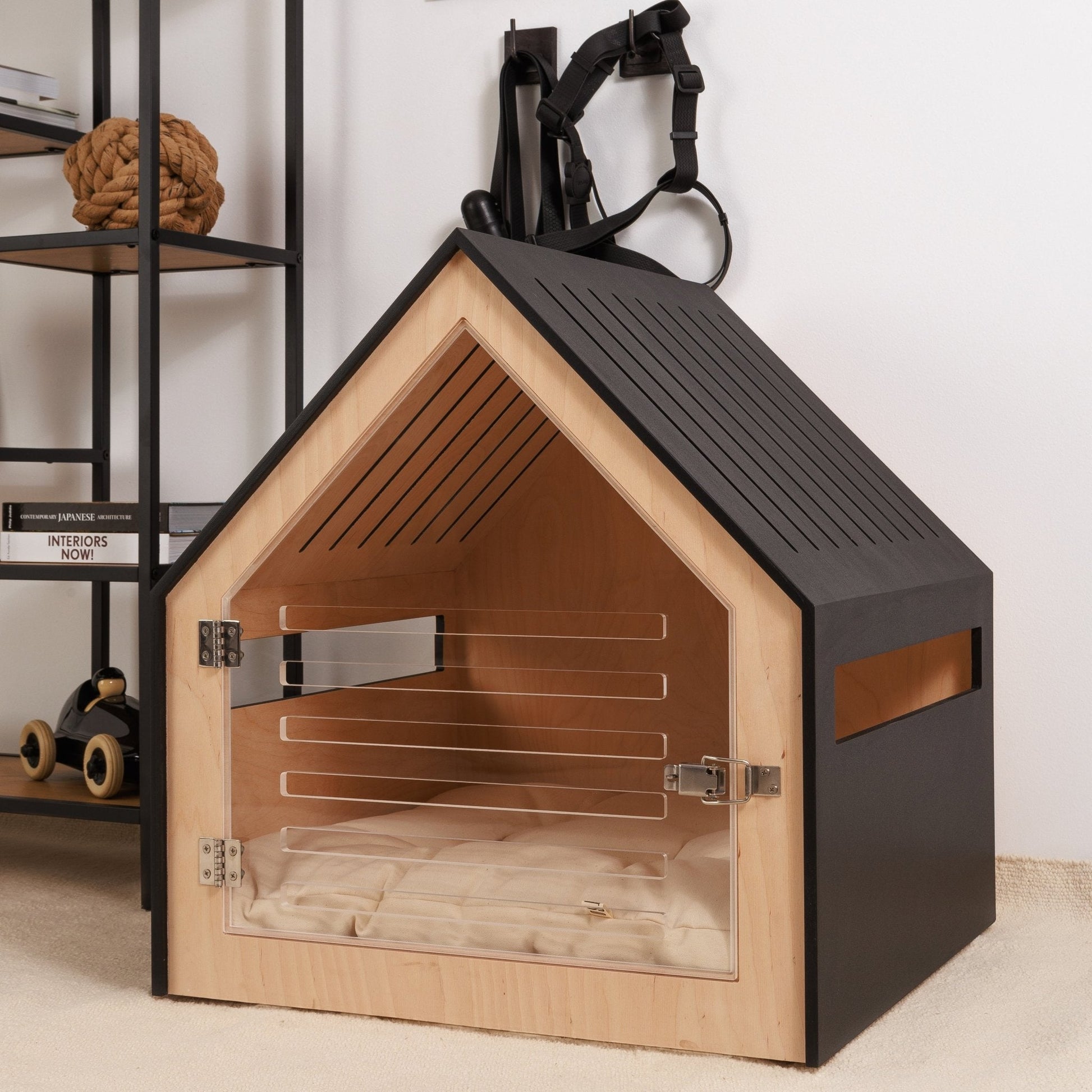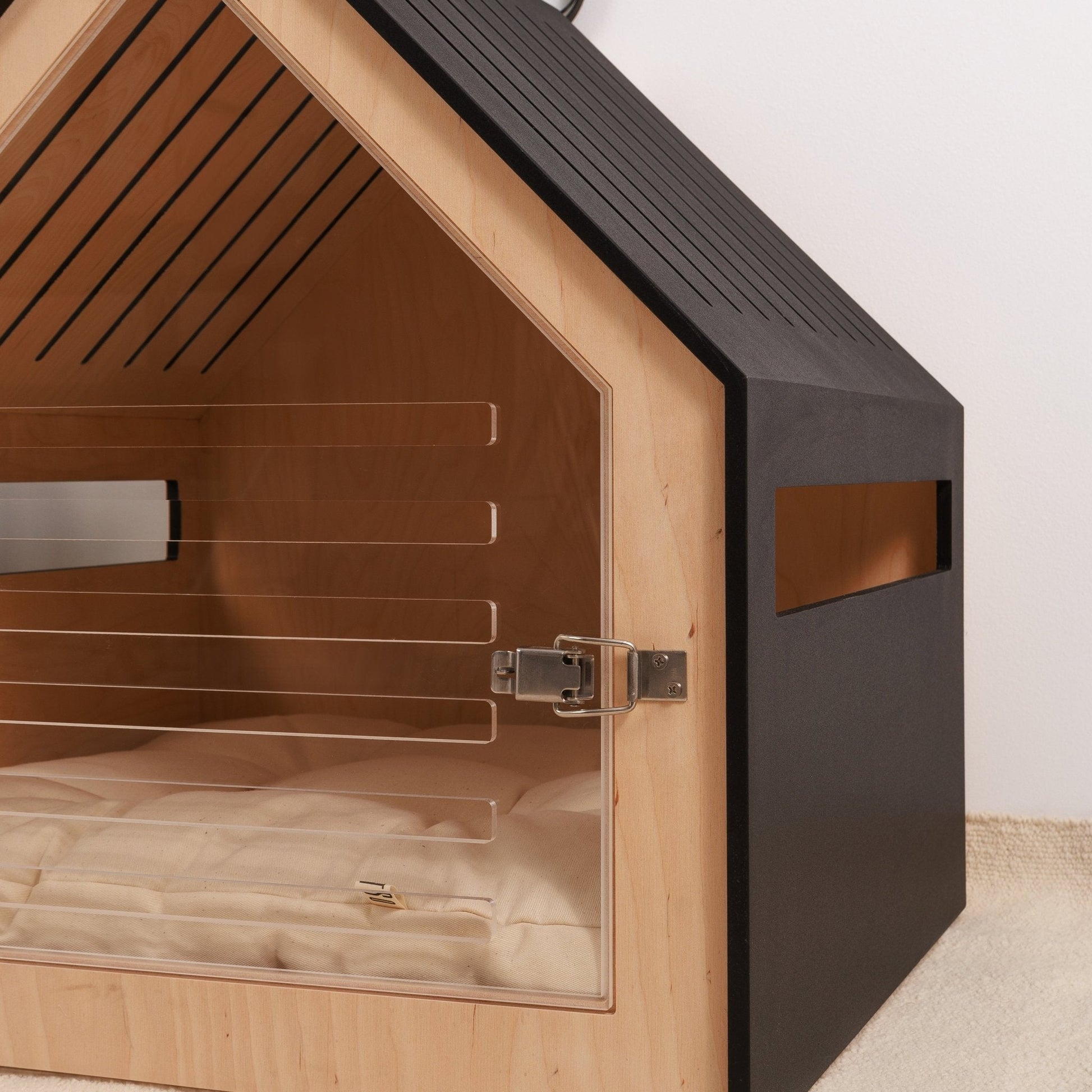 This dog crate features a modern and stylish design. It is made from high-quality birch plywood, ensuring durability and an elegant appearance. The front is equipped with clear acrylic doors, providing excellent visibility inside. The doors are secured with a reliable stainless steel latch for added safety. Inside, a soft cushion ensures maximum comfort for your pet.