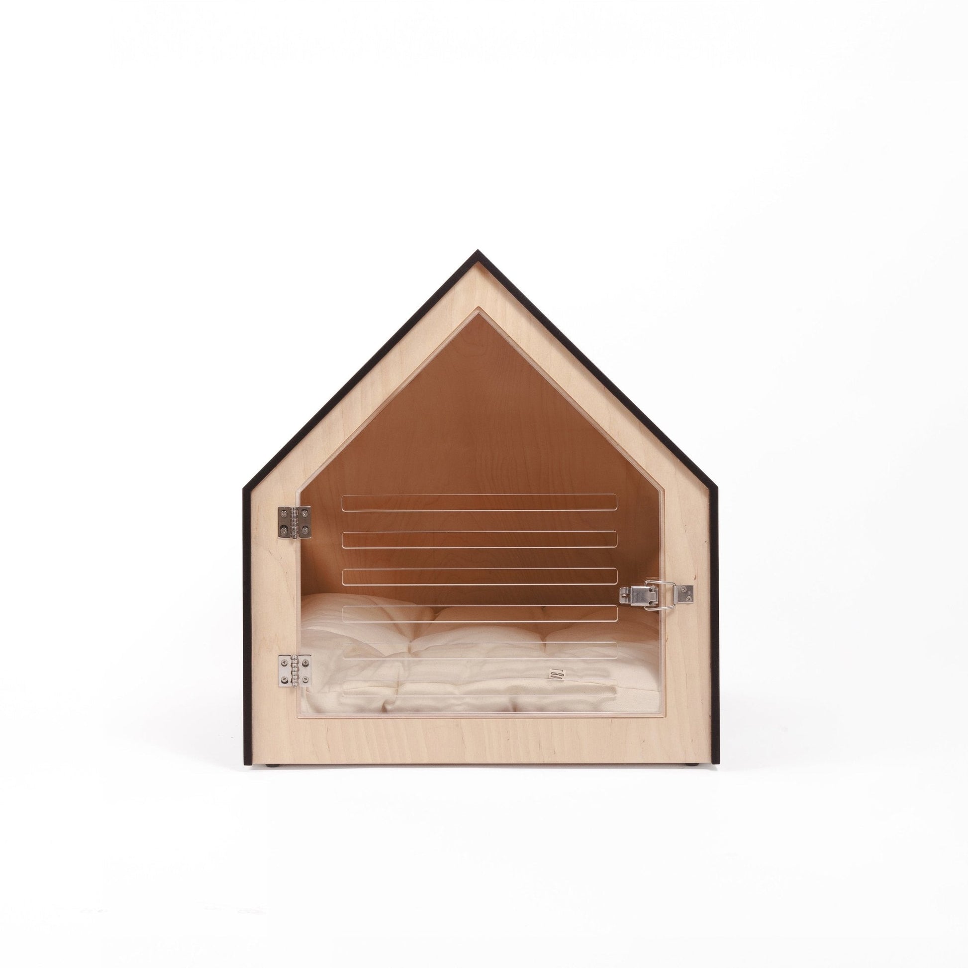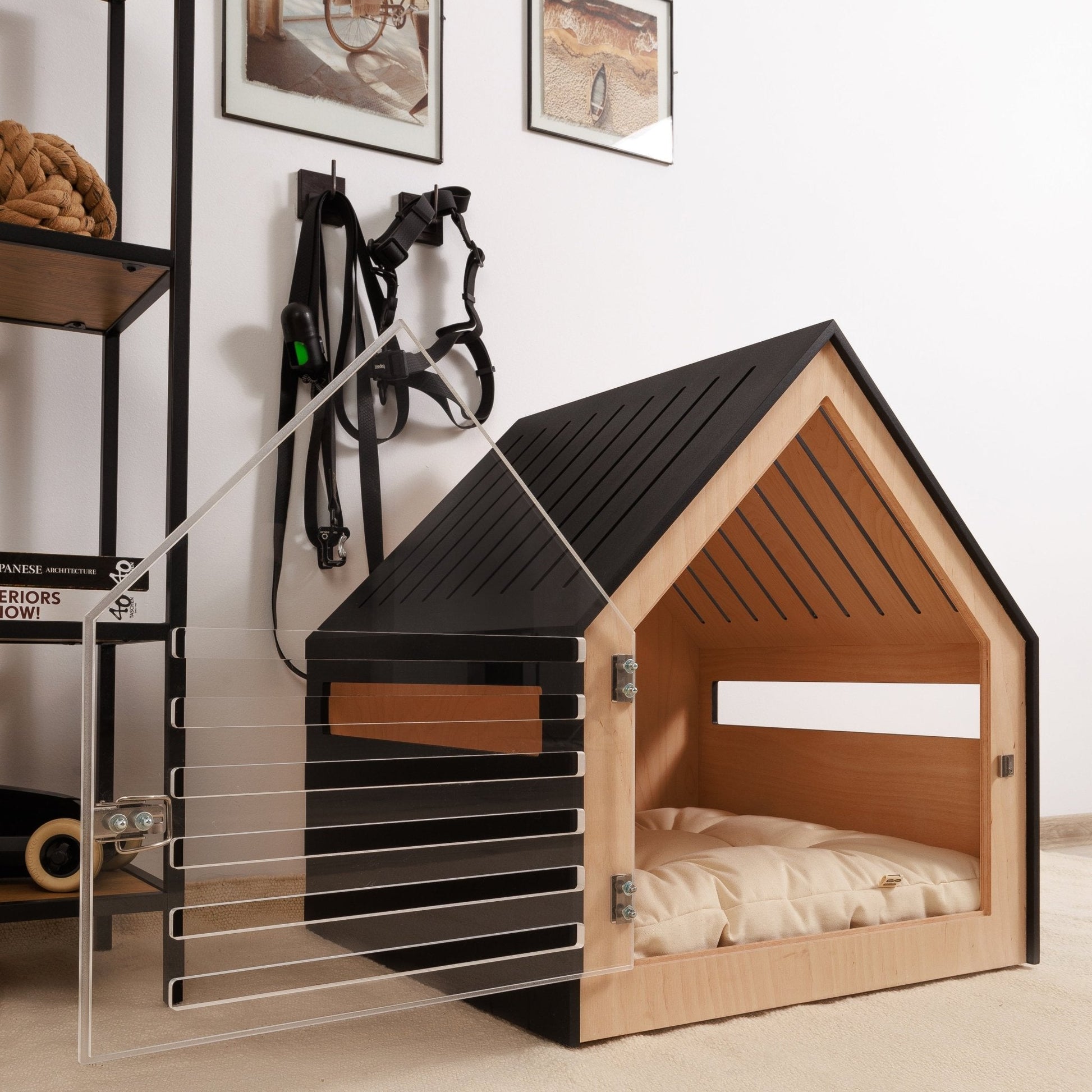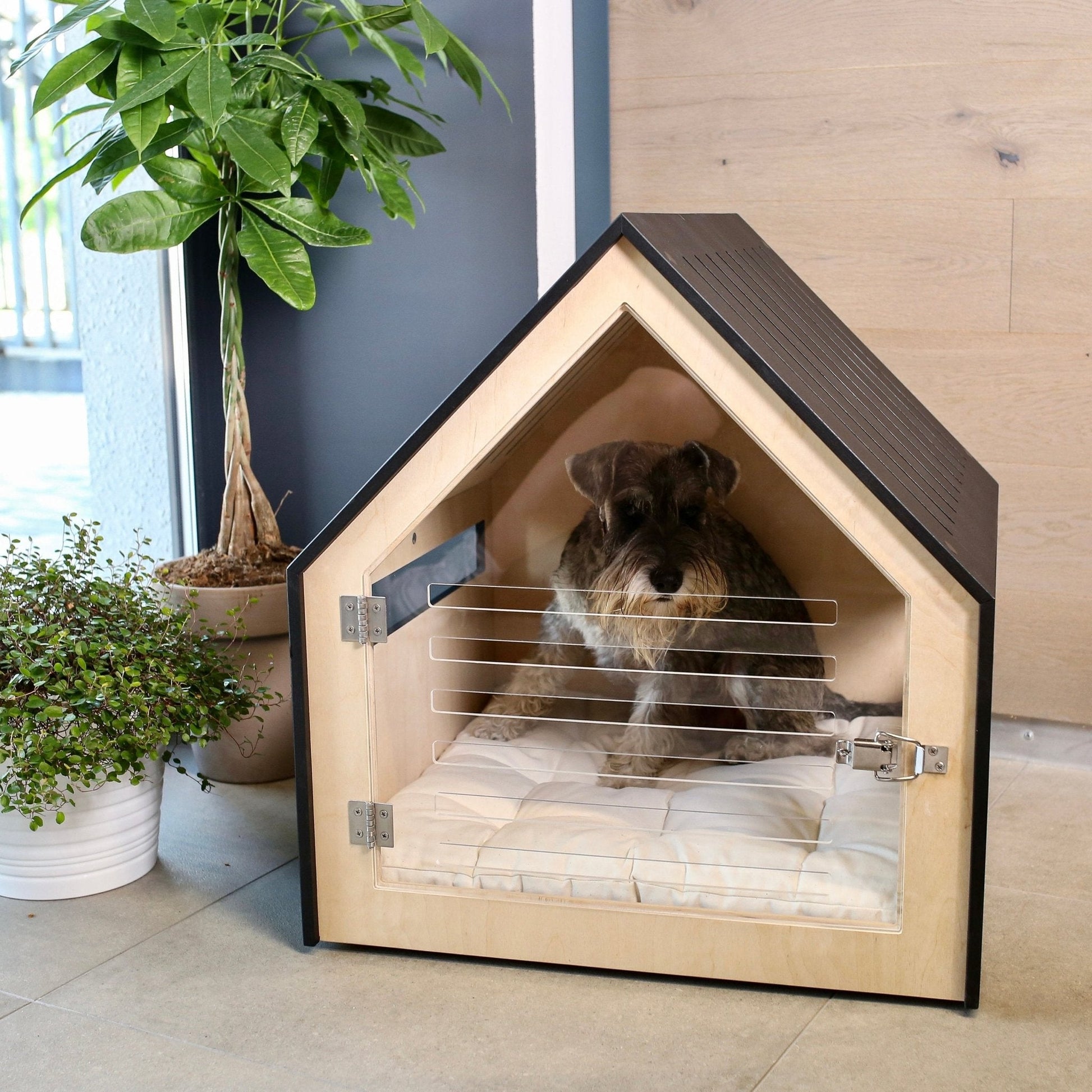 This dog crate features a modern and stylish design. It is made from high-quality birch plywood, ensuring durability and an elegant appearance. The front is equipped with clear acrylic doors, providing excellent visibility inside. The doors are secured with a reliable stainless steel latch for added safety. Inside, a soft cushion ensures maximum comfort for your pet.