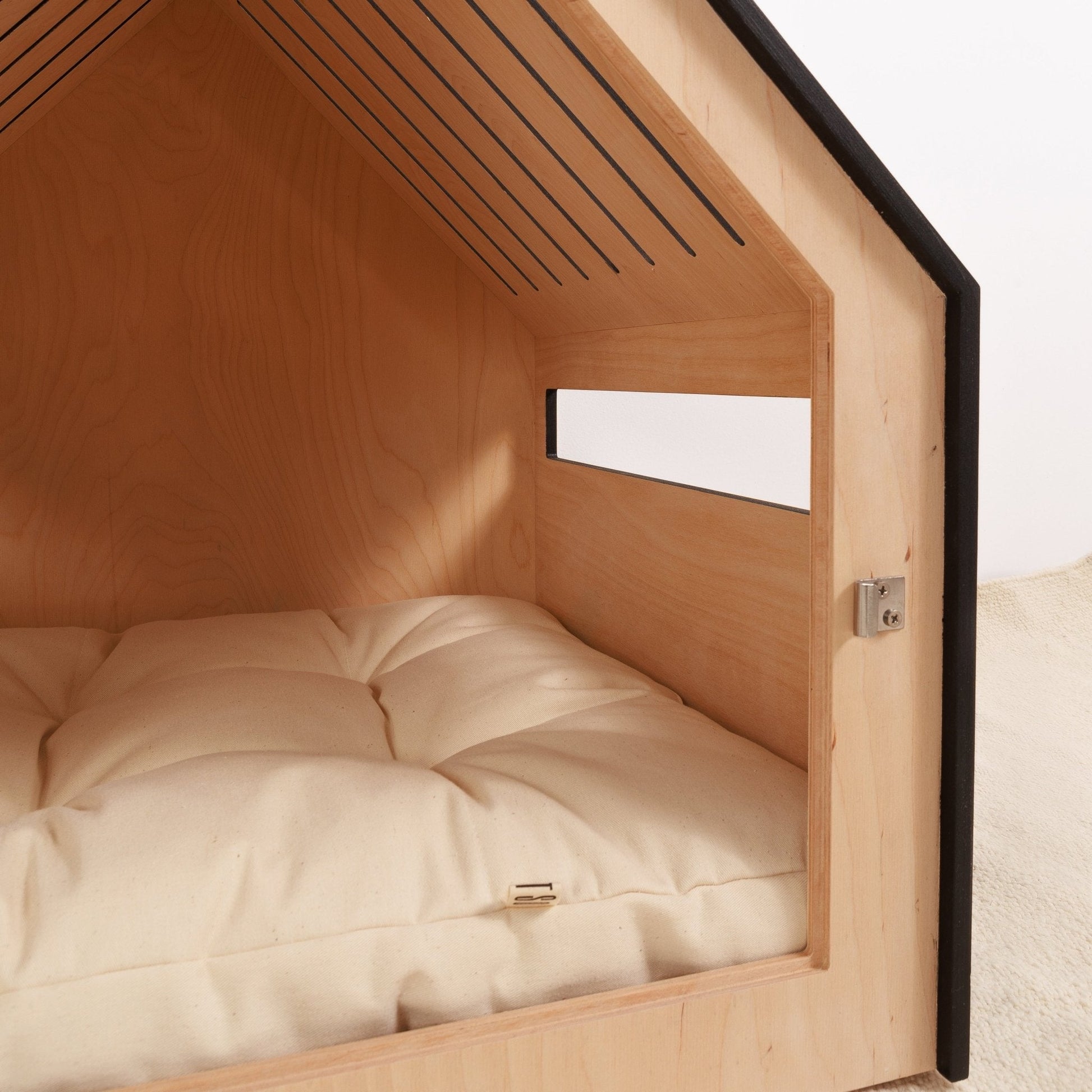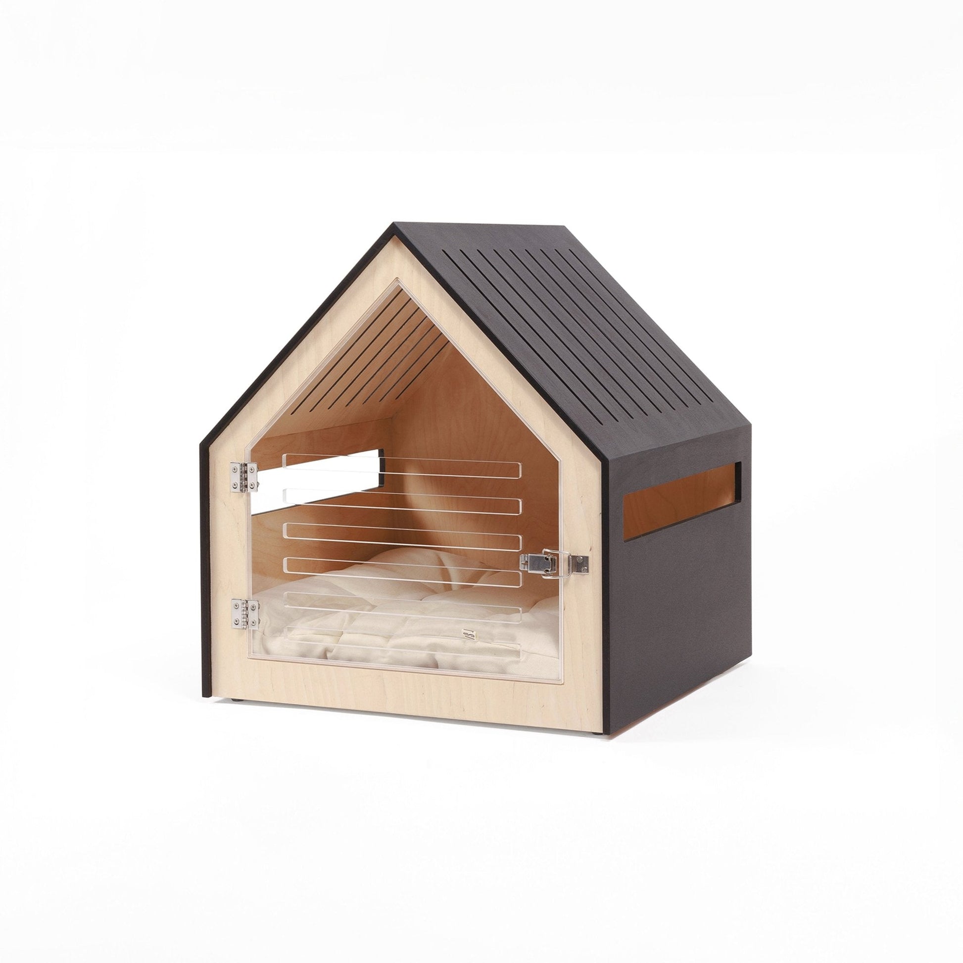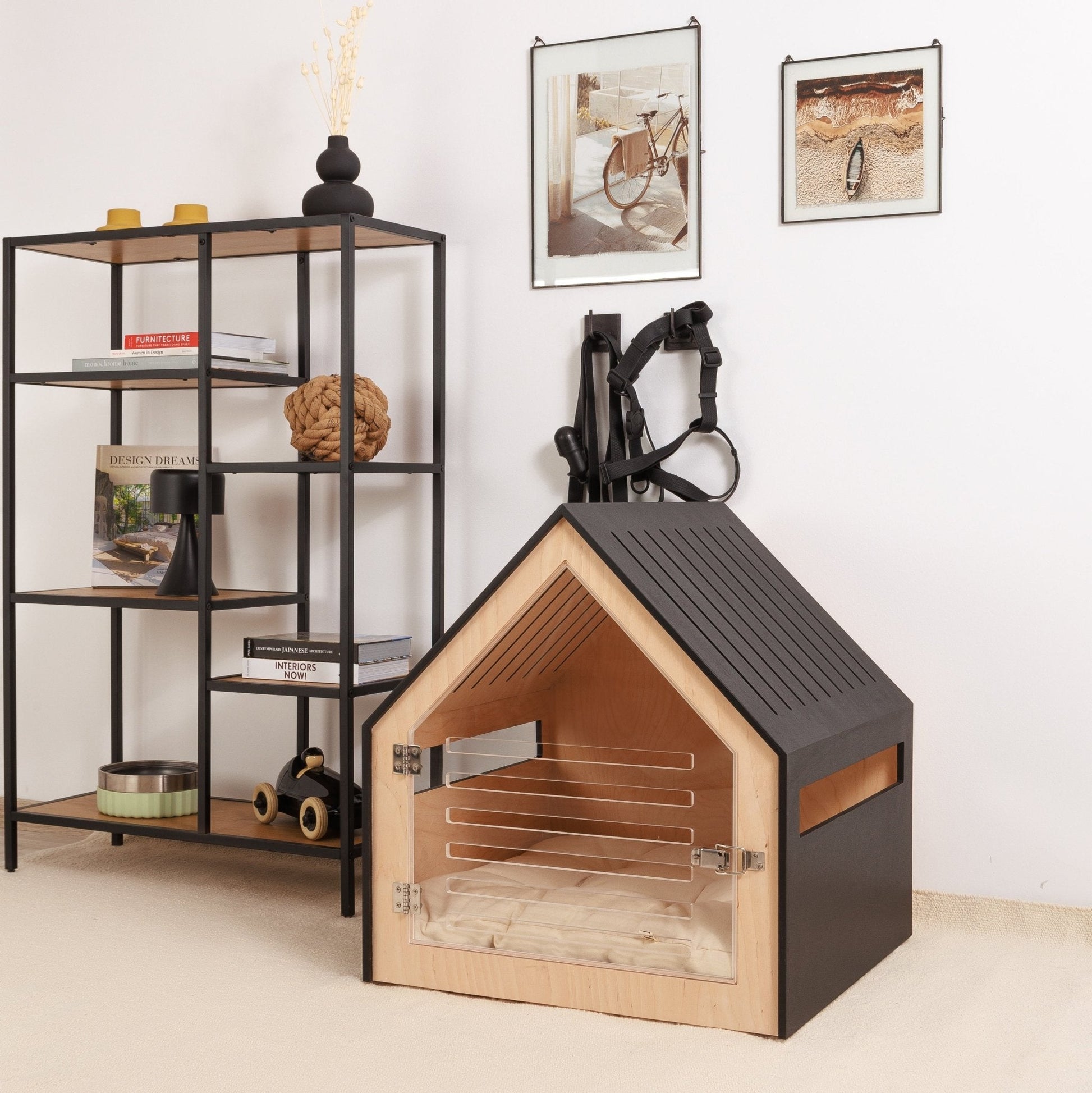 The crate is designed with proper ventilation in mind, featuring slotted openings that maintain fresh air circulation. Its materials are eco-friendly and non-toxic, reflecting a commitment to sustainability. This design caters to the natural needs of animals, offering a cozy and safe retreat. Perfect for interiors with minimalist or Scandinavian aesthetics.