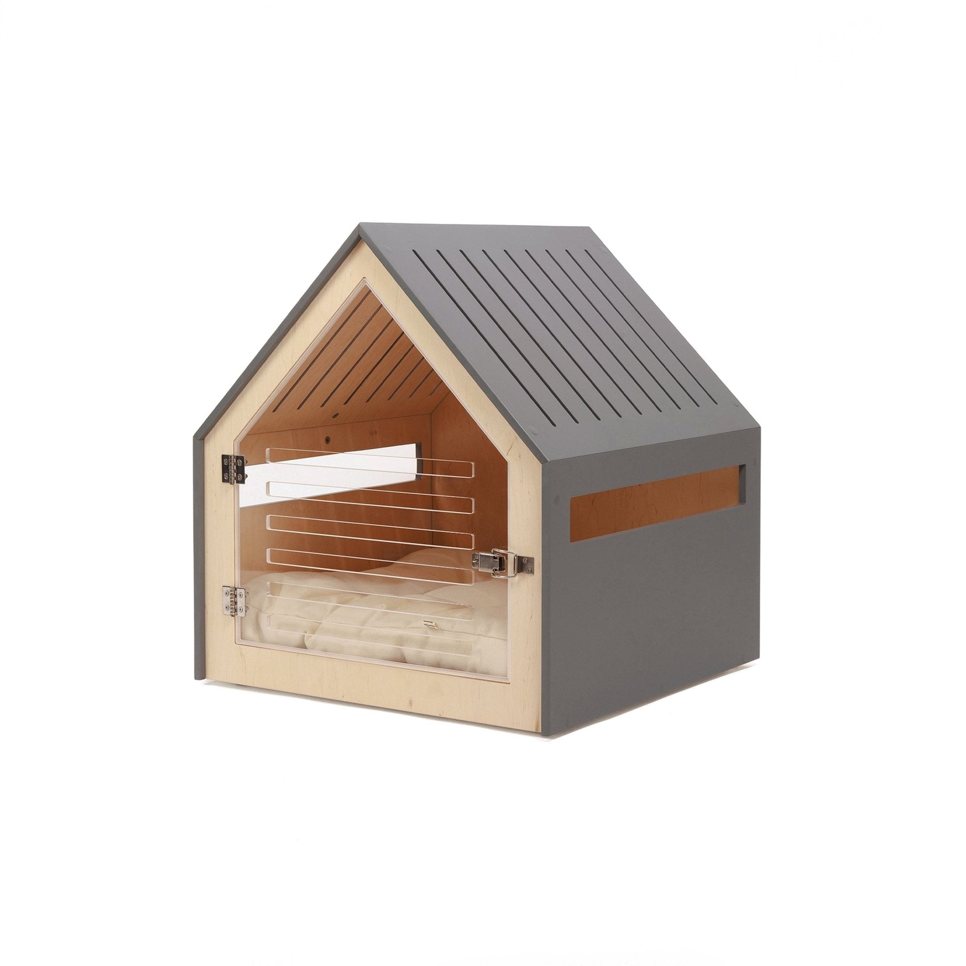 The crate is designed with proper ventilation in mind, featuring slotted openings that maintain fresh air circulation. Its materials are eco-friendly and non-toxic, reflecting a commitment to sustainability. This design caters to the natural needs of animals, offering a cozy and safe retreat. Perfect for interiors with minimalist or Scandinavian aesthetics.