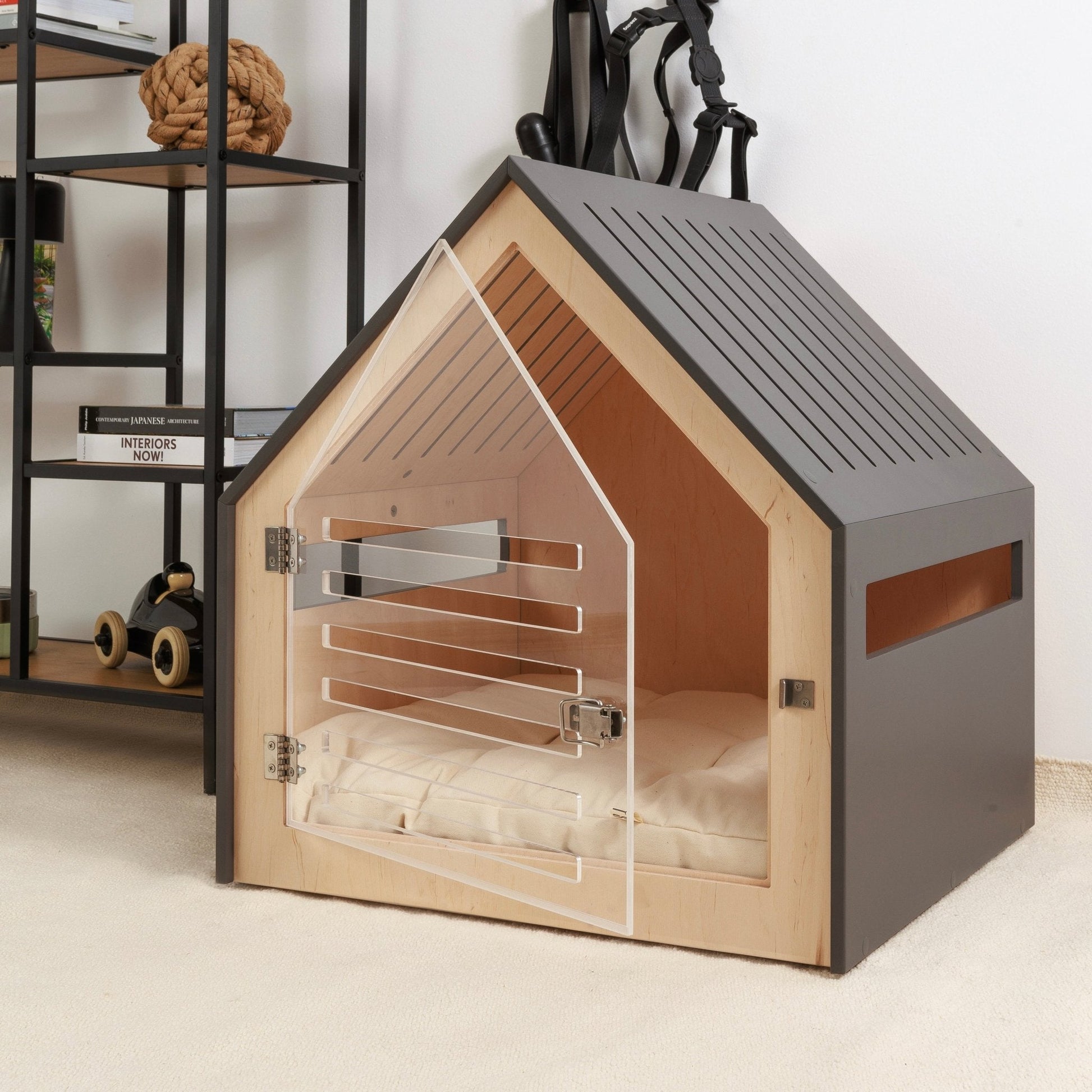 This dog crate features a modern and stylish design. It is made from high-quality birch plywood, ensuring durability and an elegant appearance. The front is equipped with clear acrylic doors, providing excellent visibility inside. The doors are secured with a reliable stainless steel latch for added safety. Inside, a soft cushion ensures maximum comfort for your pet.