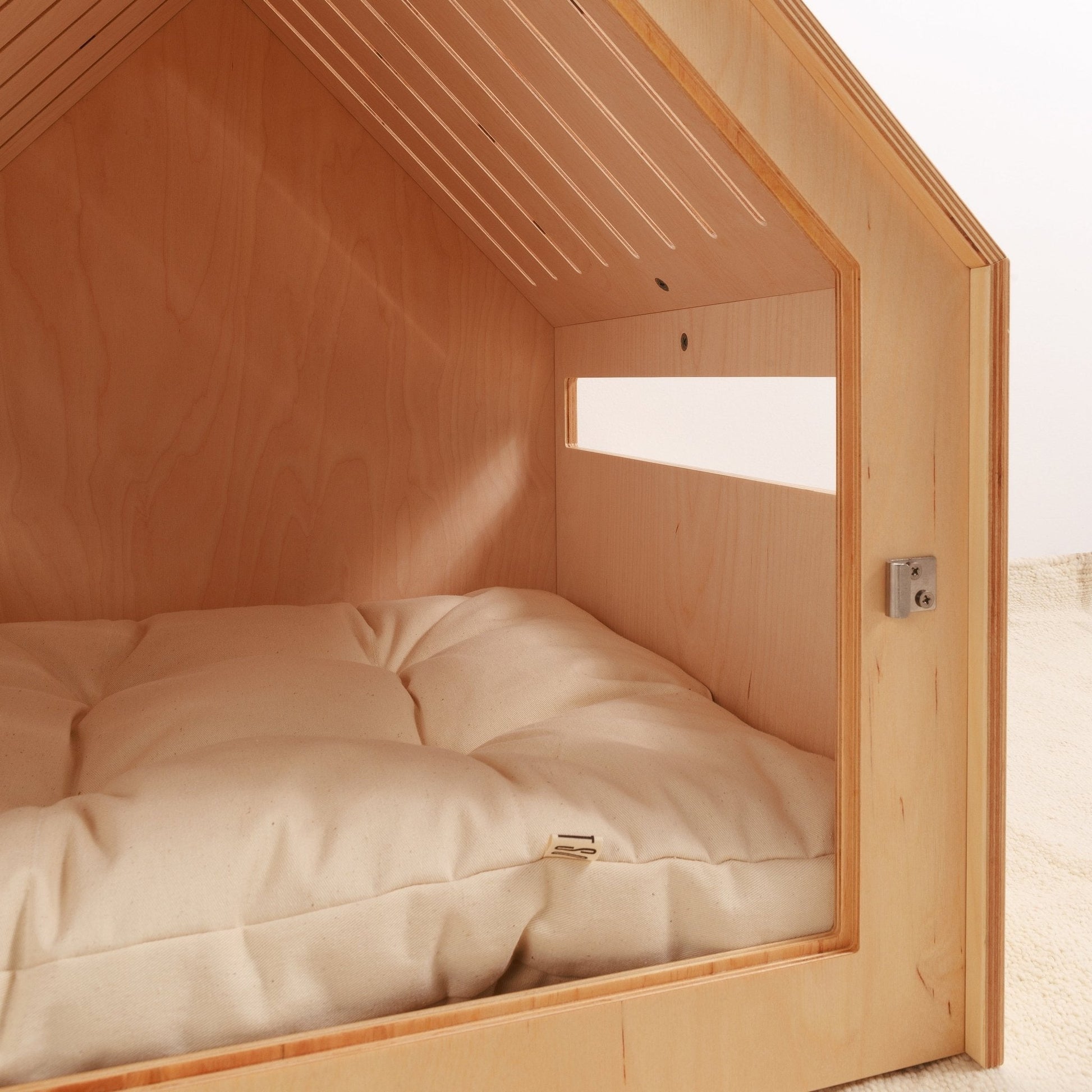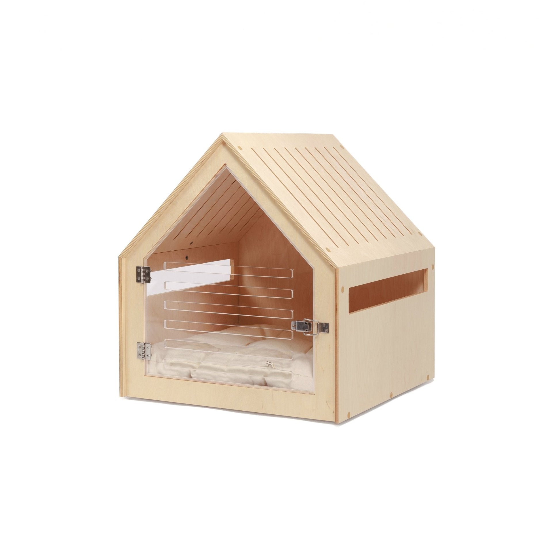 The crate is designed with proper ventilation in mind, featuring slotted openings that maintain fresh air circulation. Its materials are eco-friendly and non-toxic, reflecting a commitment to sustainability. This design caters to the natural needs of animals, offering a cozy and safe retreat. Perfect for interiors with minimalist or Scandinavian aesthetics.
