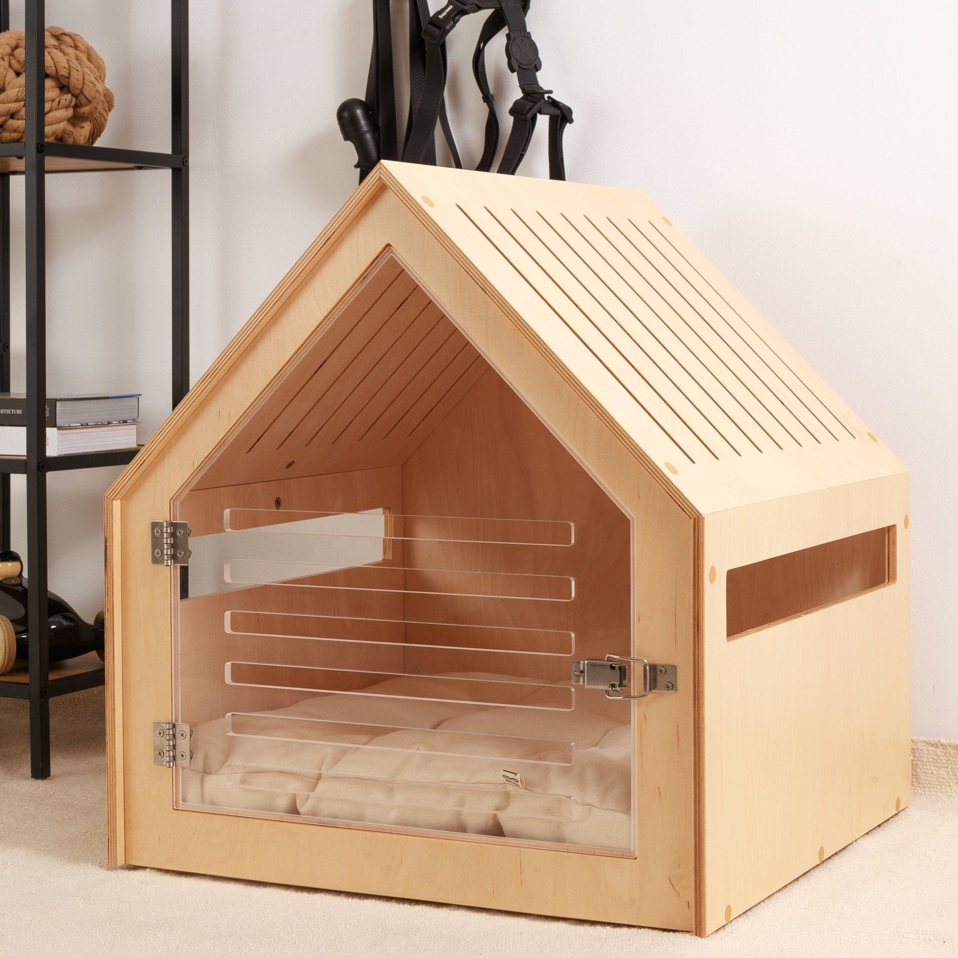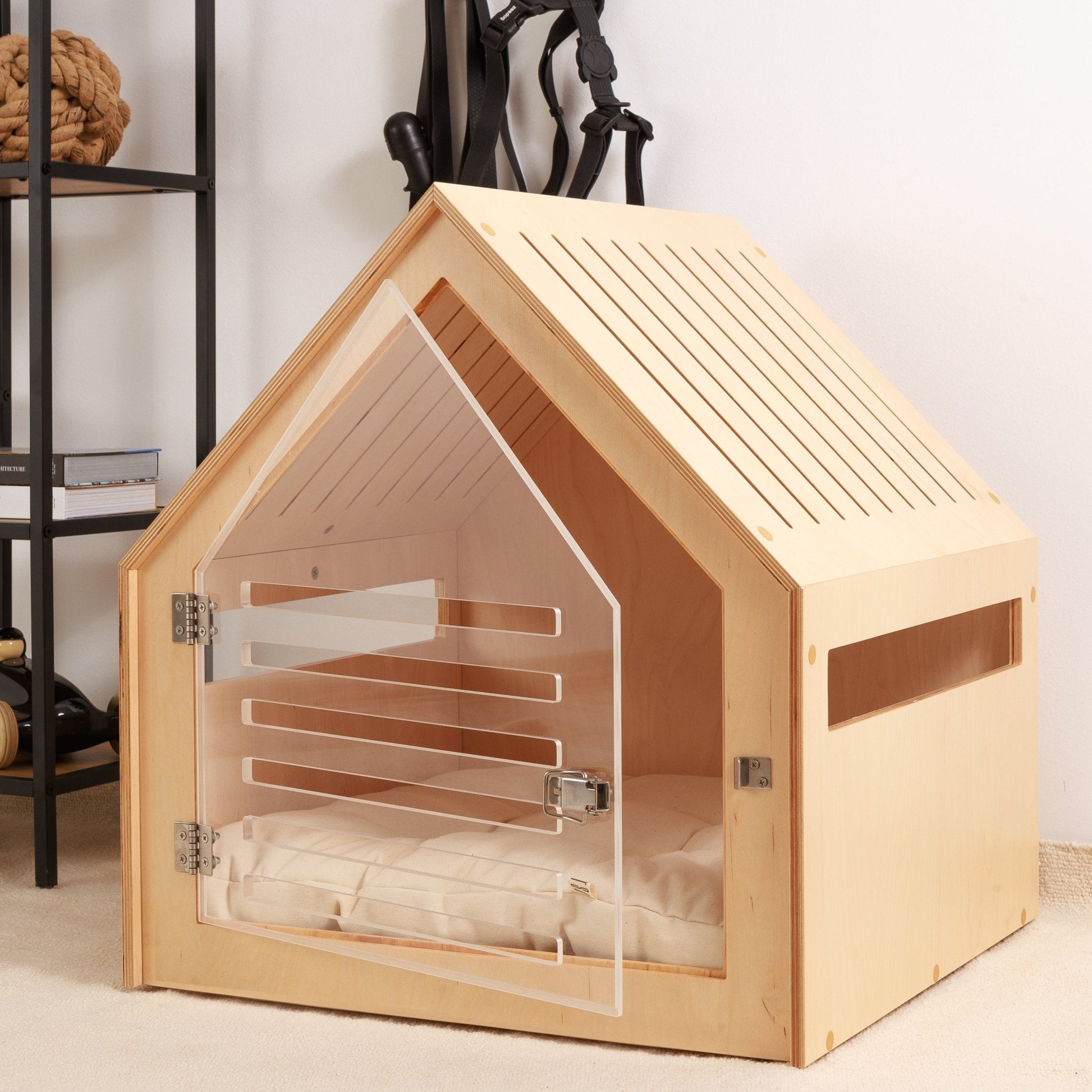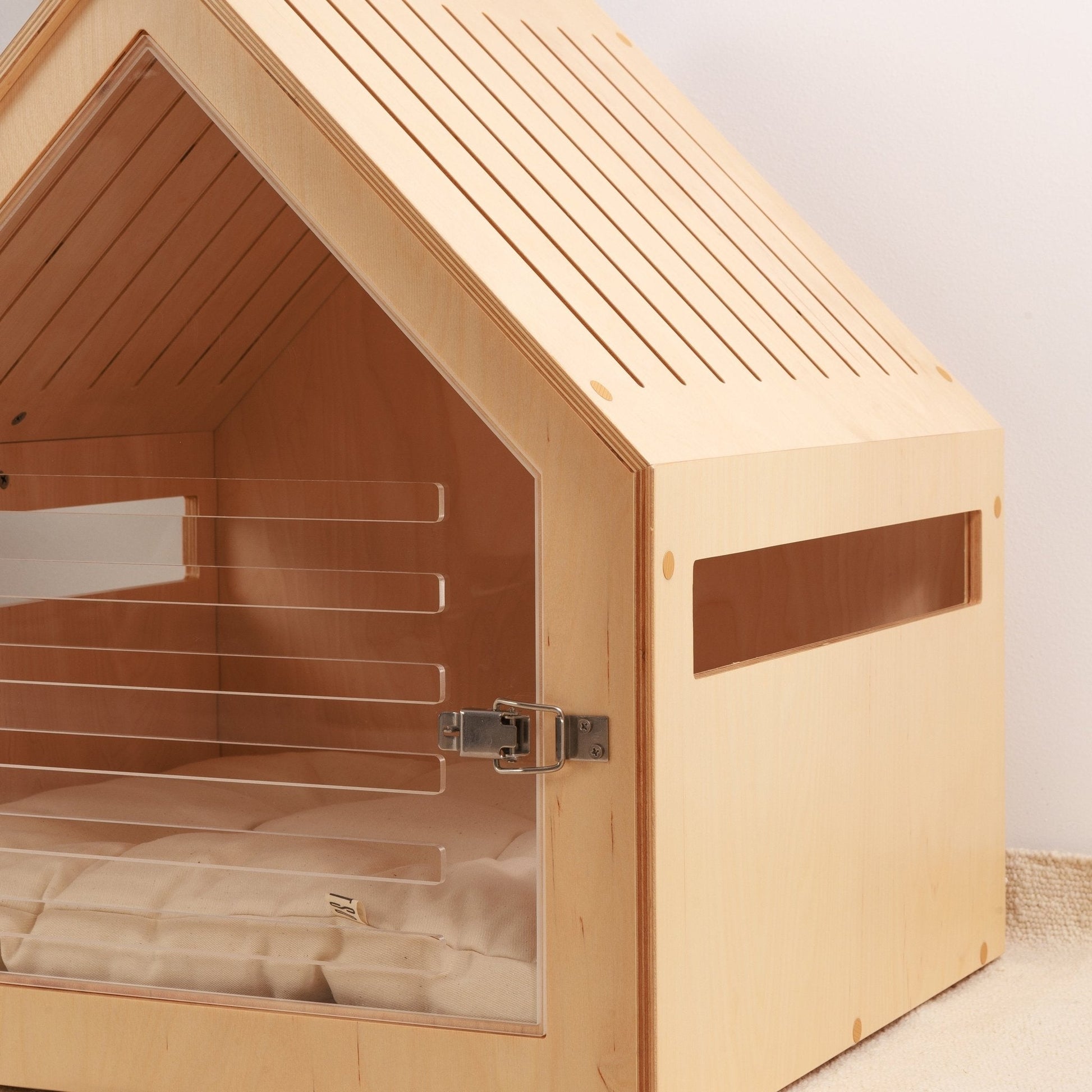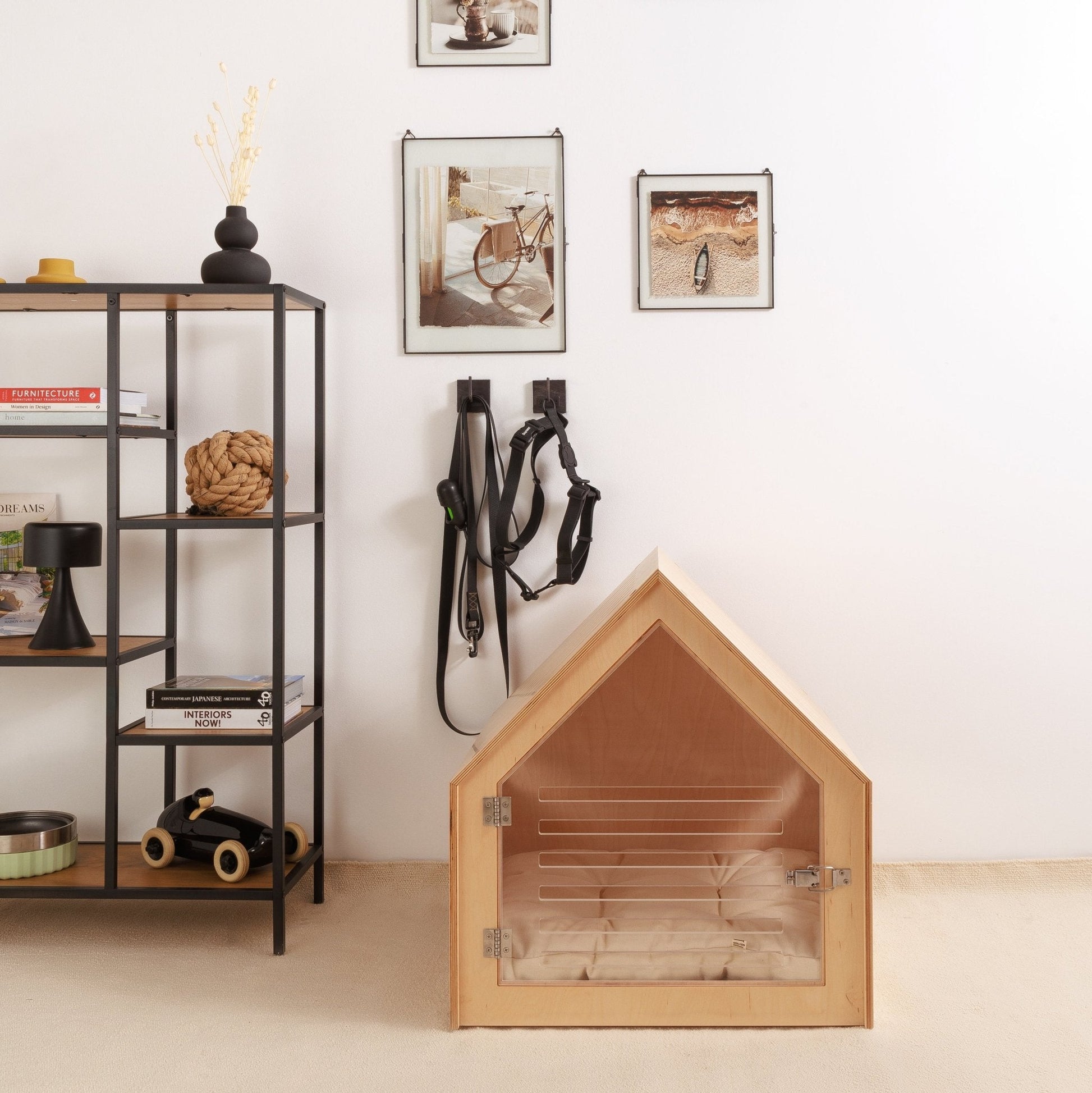 This dog crate features a modern and stylish design. It is made from high-quality birch plywood, ensuring durability and an elegant appearance. The front is equipped with clear acrylic doors, providing excellent visibility inside. The doors are secured with a reliable stainless steel latch for added safety. Inside, a soft cushion ensures maximum comfort for your pet.