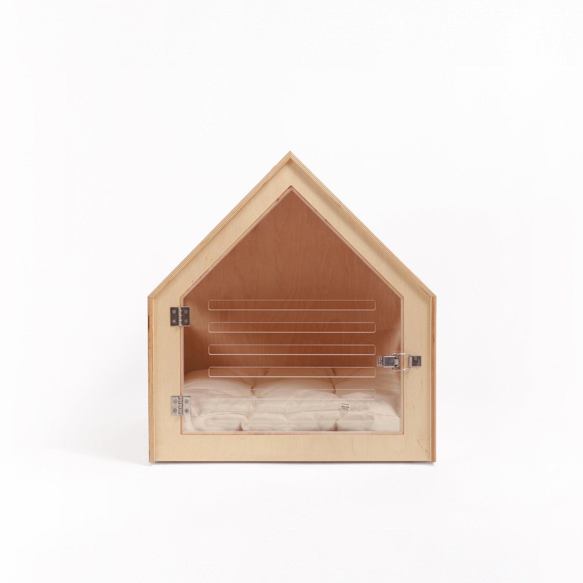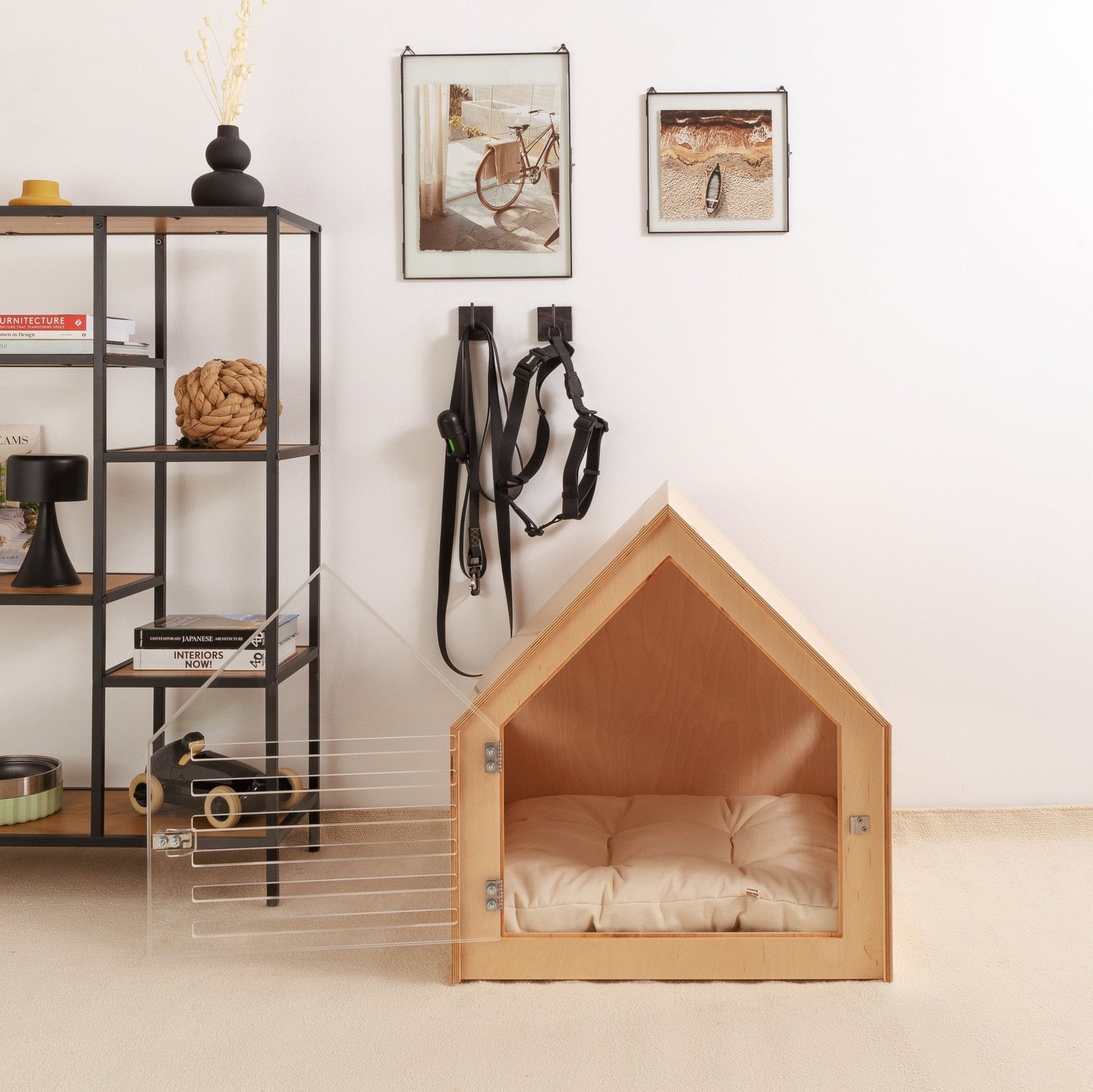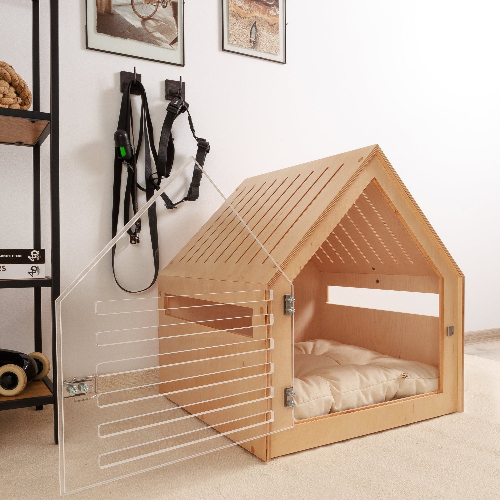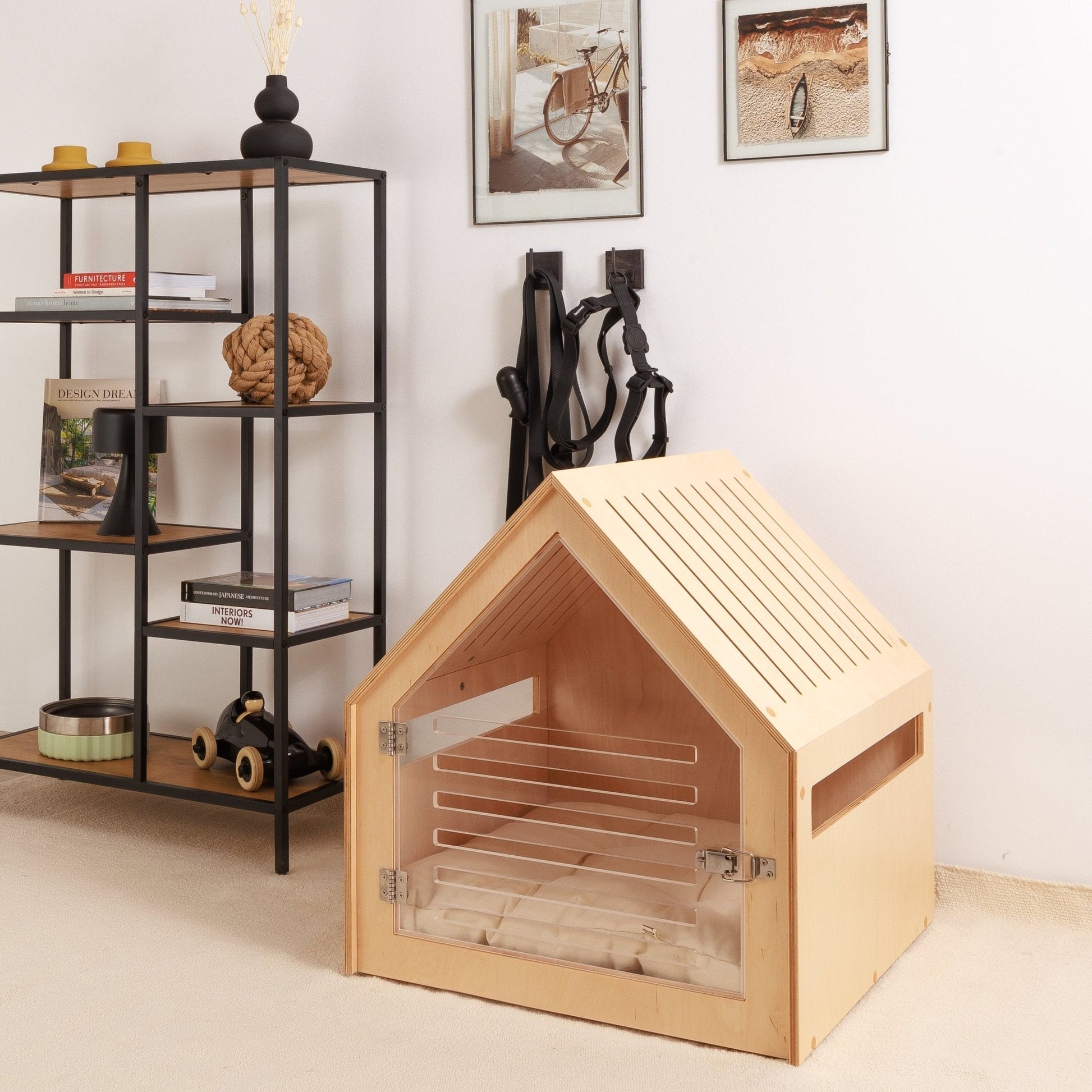 This dog crate features a modern and stylish design. It is made from high-quality birch plywood, ensuring durability and an elegant appearance. The front is equipped with clear acrylic doors, providing excellent visibility inside. The doors are secured with a reliable stainless steel latch for added safety. Inside, a soft cushion ensures maximum comfort for your pet.