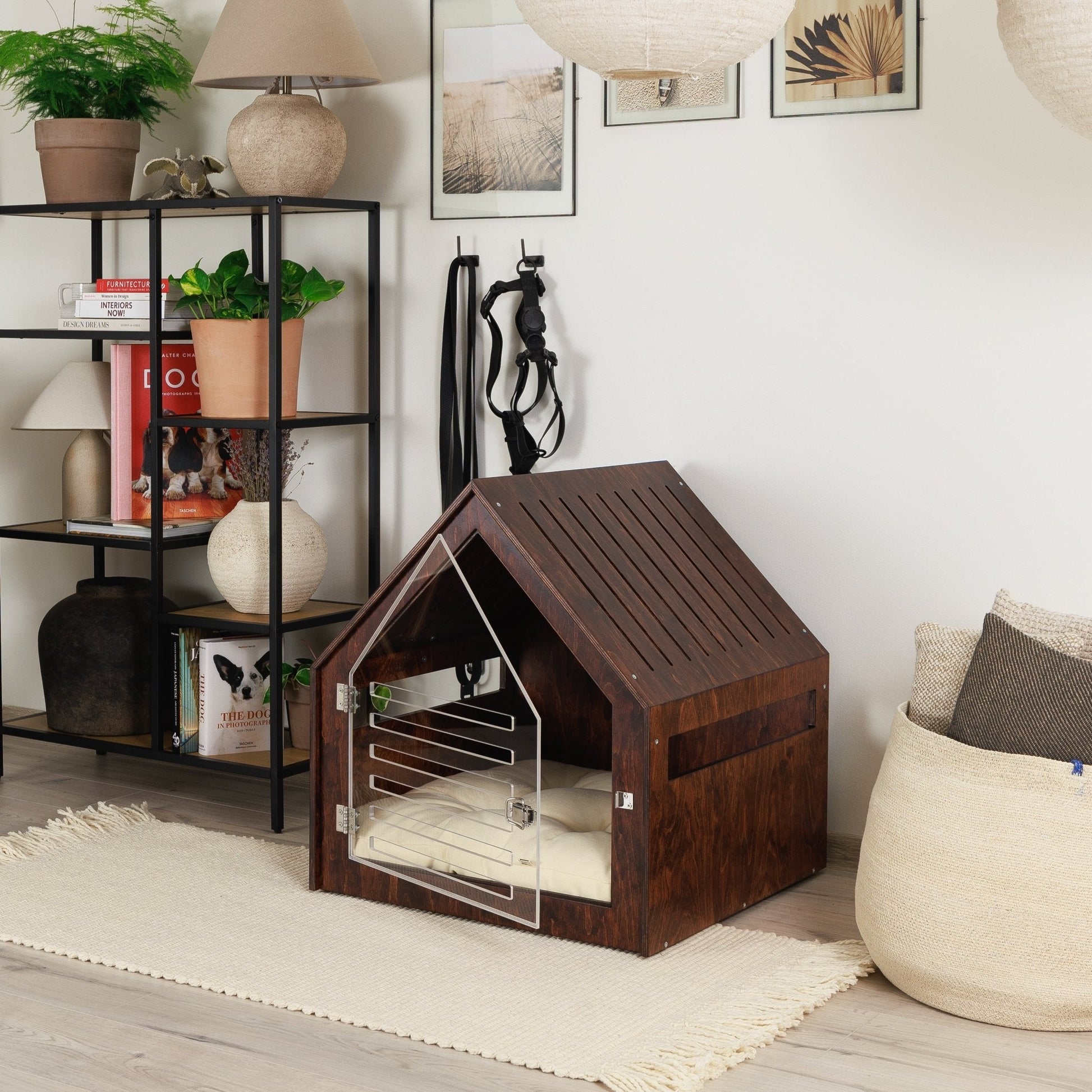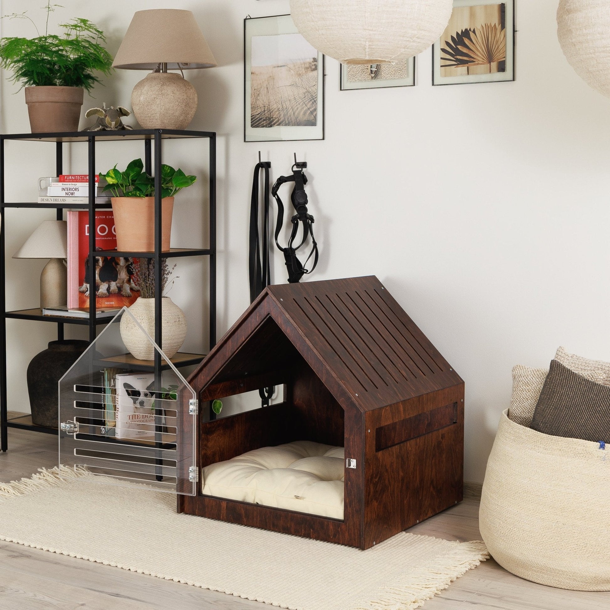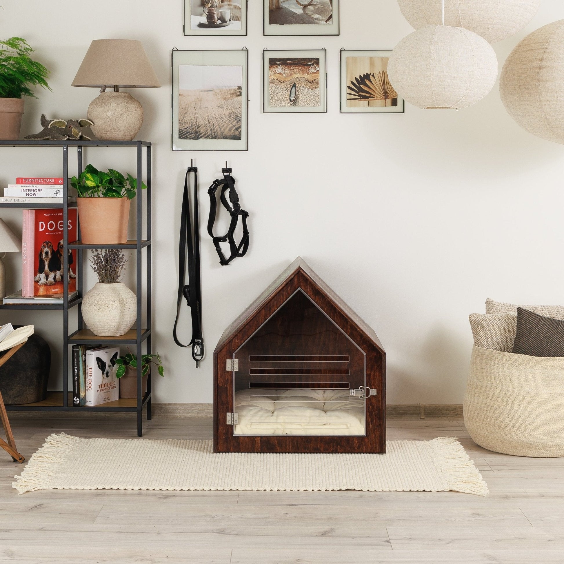 Elevate your home and pamper your pet with this beautifully crafted indoor dog house – a perfect blend of aesthetics, functionality, and comfort. Designed for modern interiors, this wooden dog house redefines traditional pet crates with its sleek silhouette and furniture-like elegance.