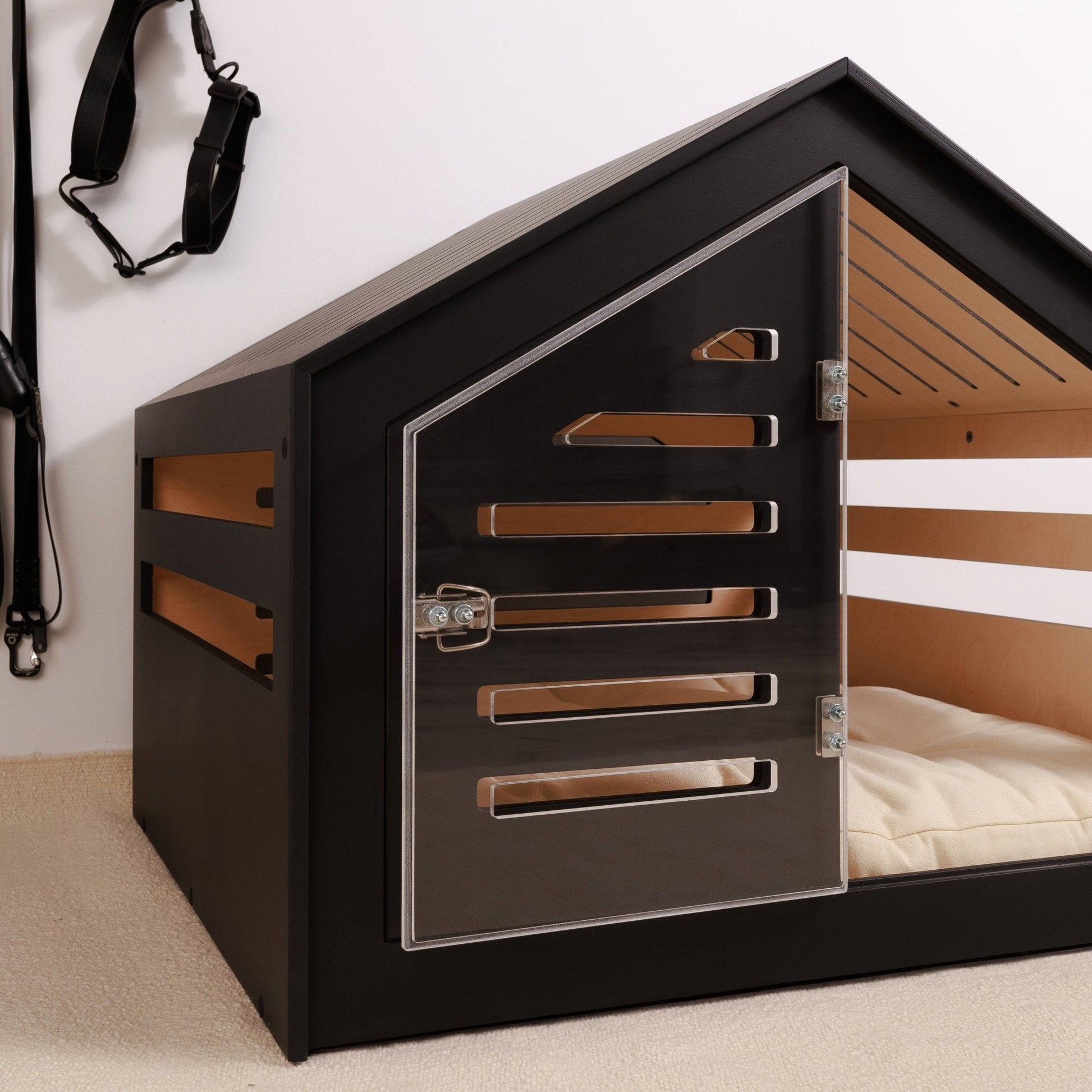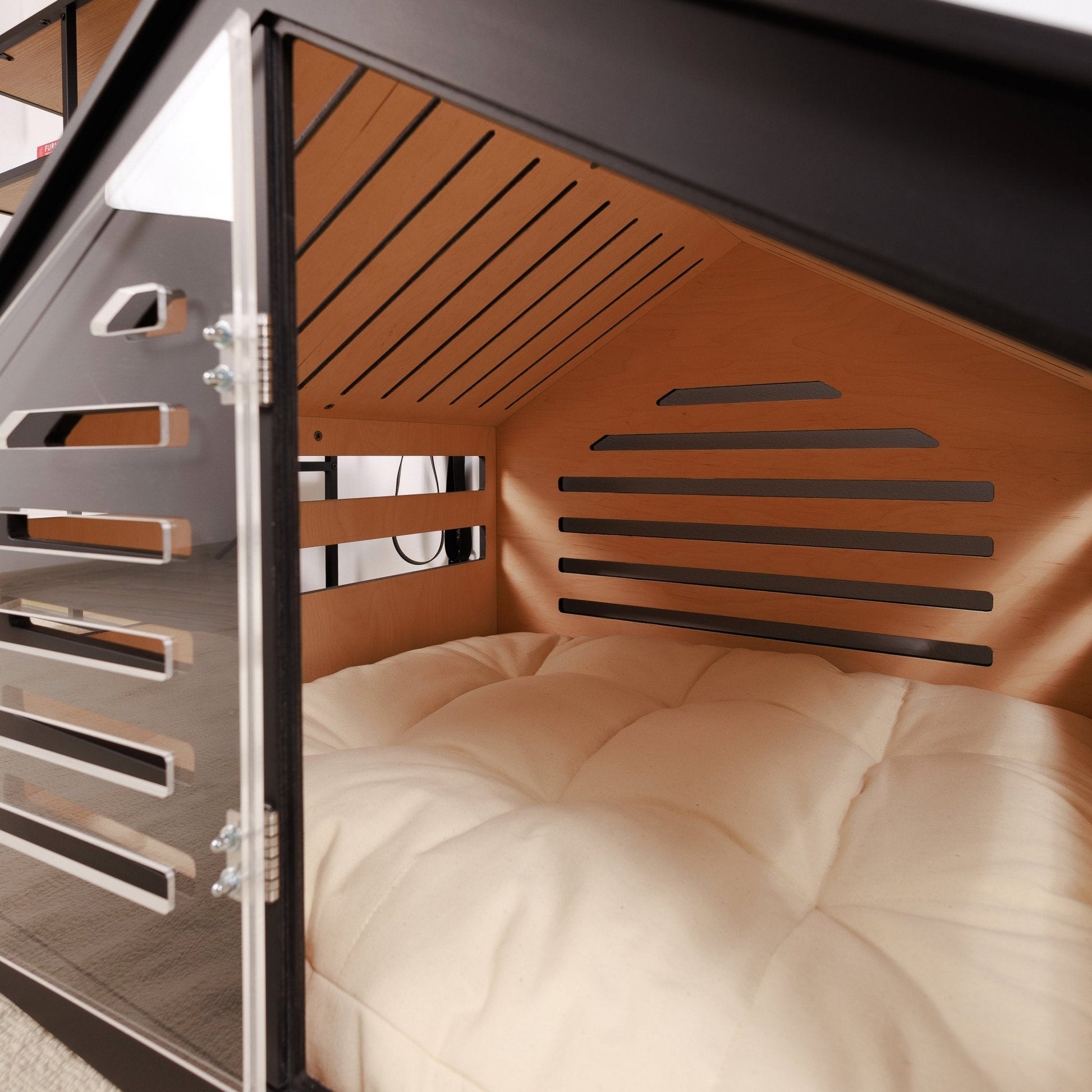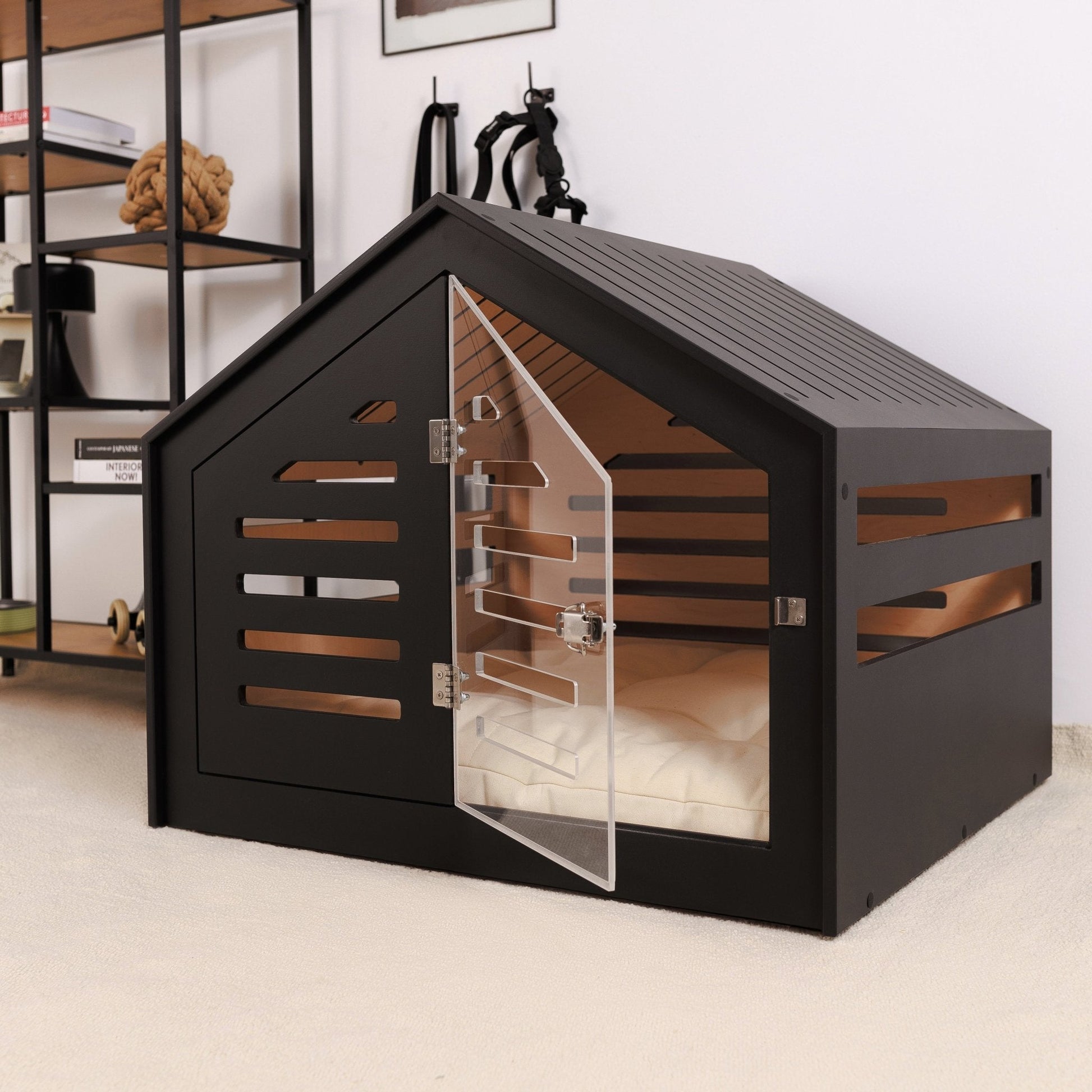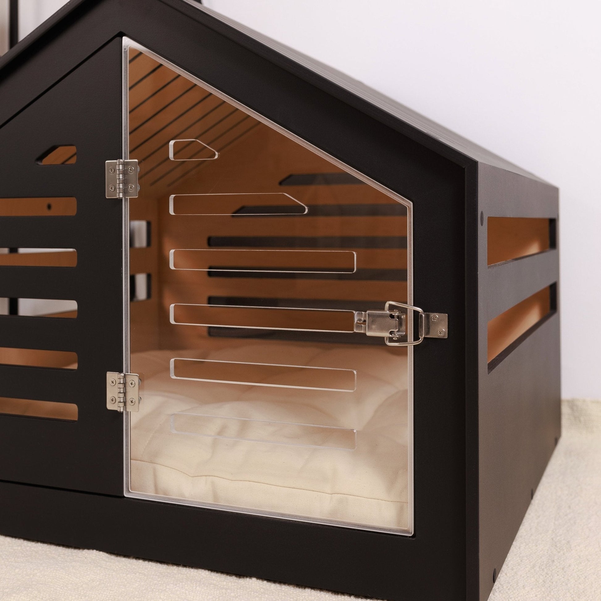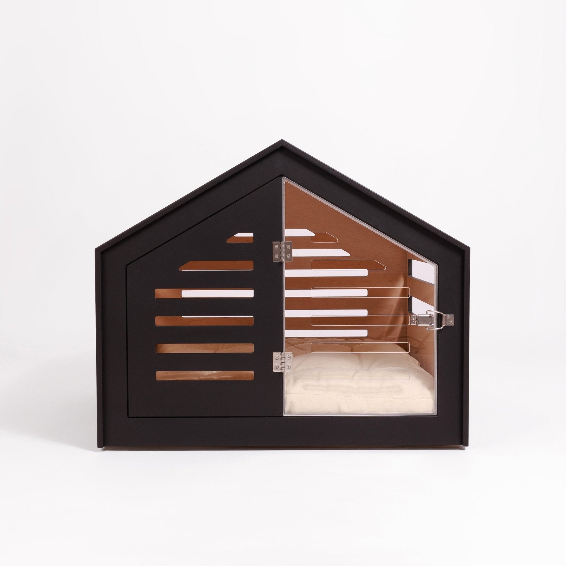 The walls include horizontal cutouts for proper airflow and natural light, ensuring your pet stays comfortable while remaining aware of their surroundings.