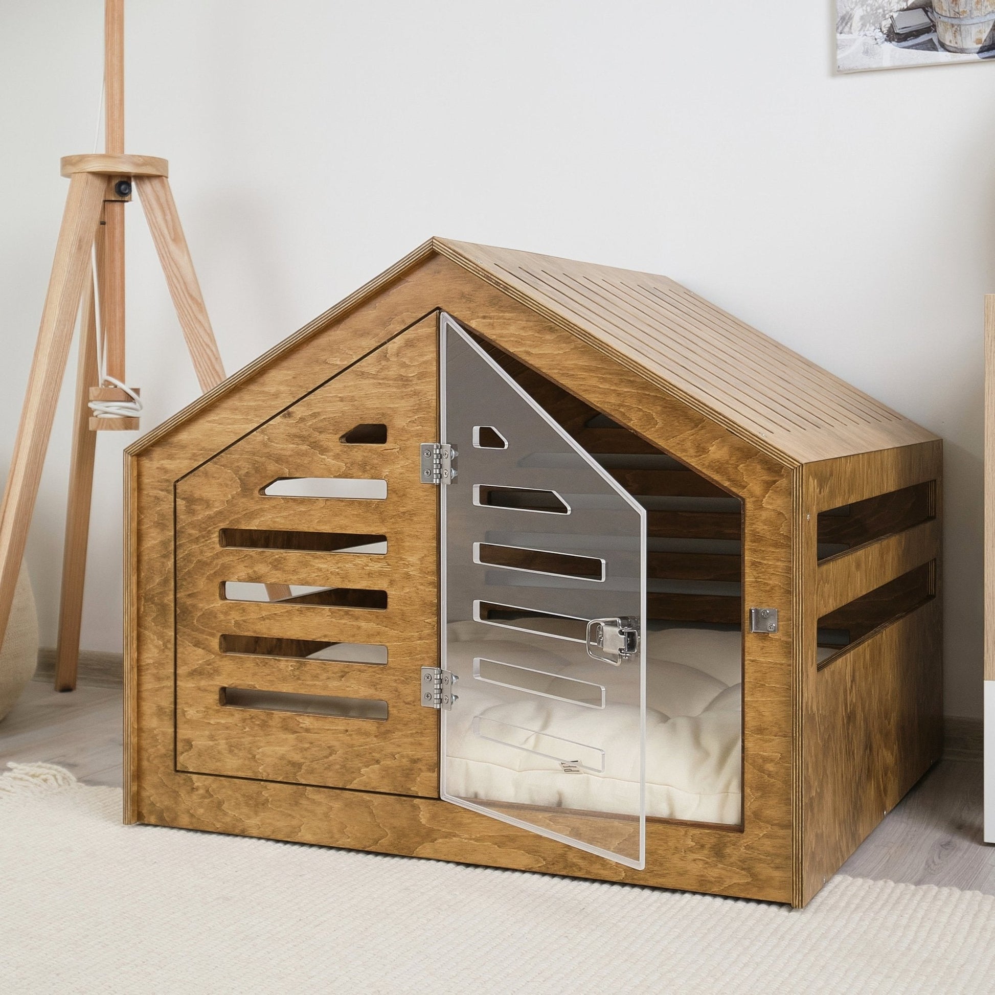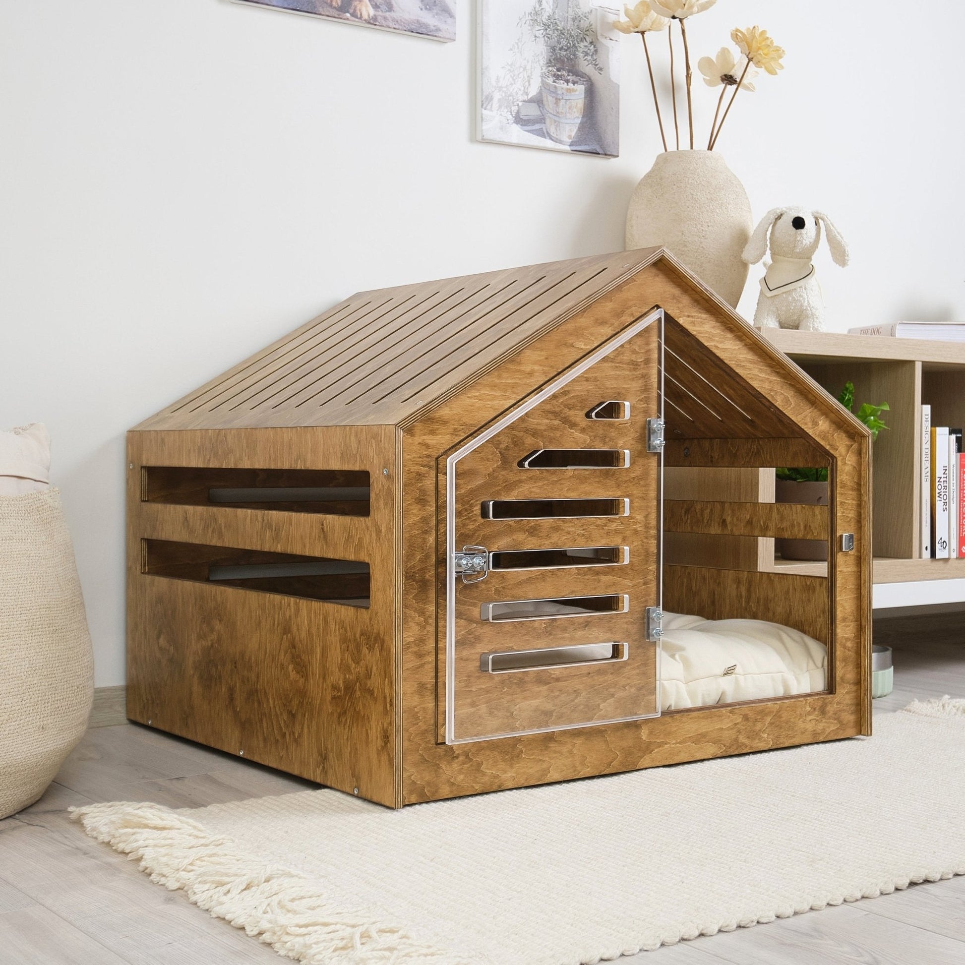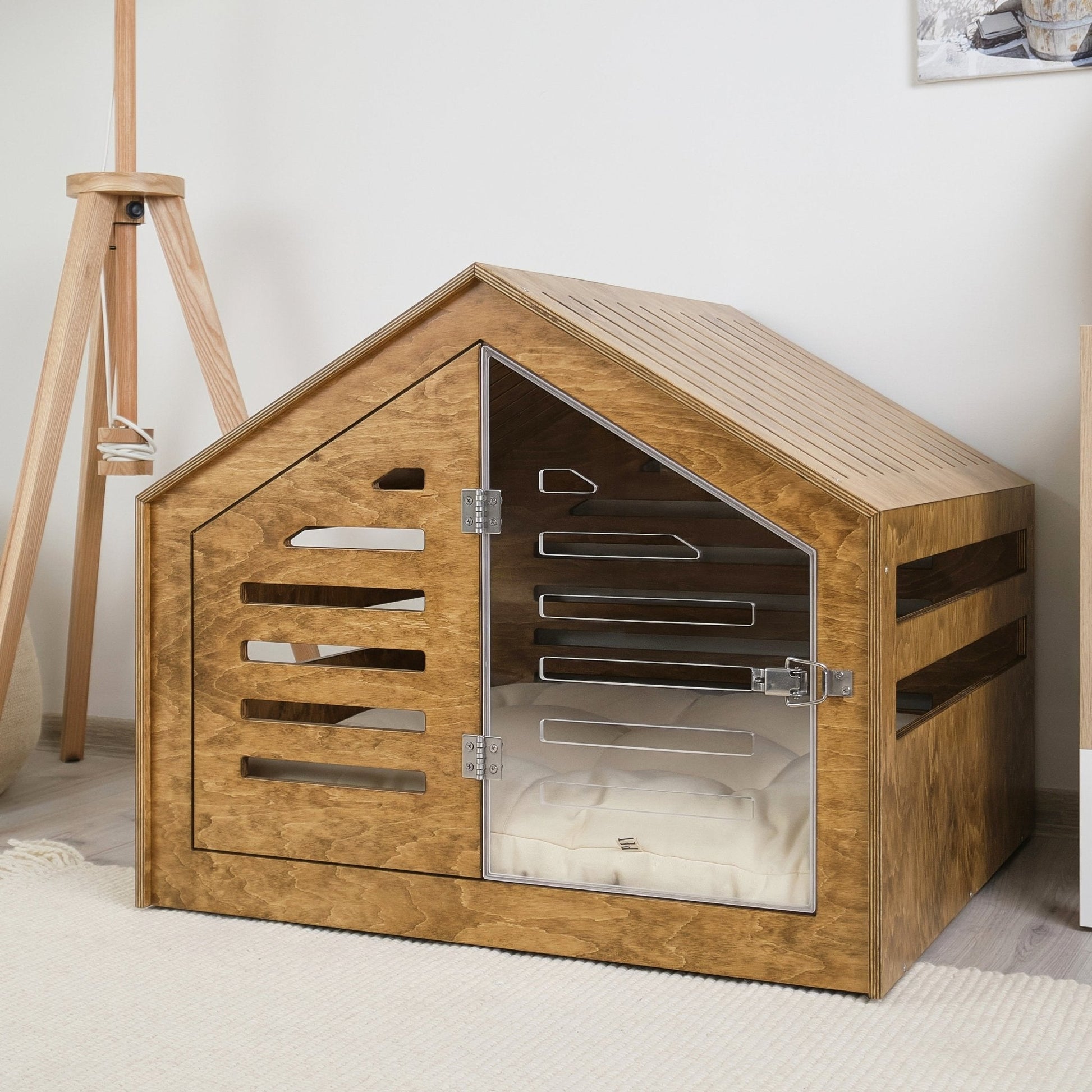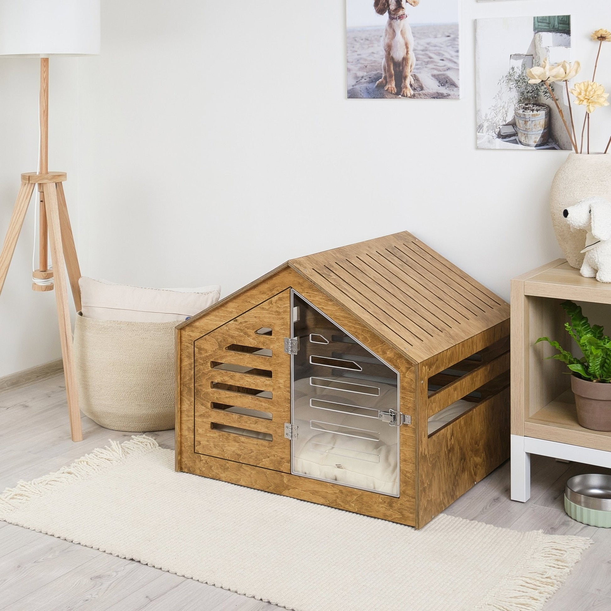 Natural Wood Finish: The surface is tinted to highlight the beauty of the wood, making this furniture crate dog an elegant addition to any living space.